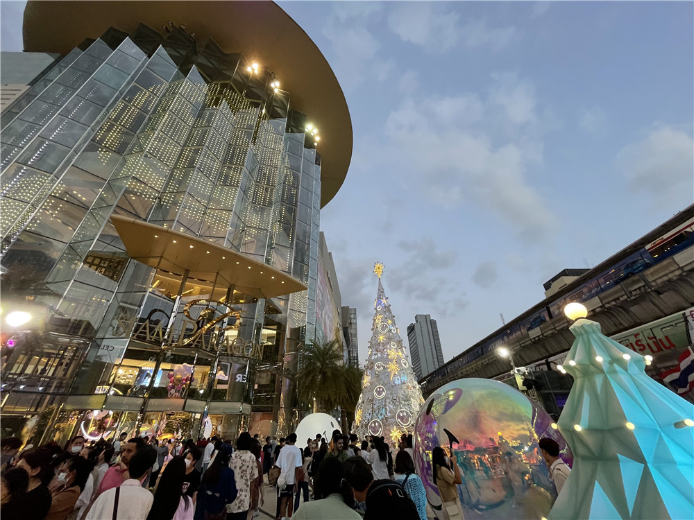 新年即将到来,曼谷知名购物中心前的人造雪景特别受欢迎(李敏摄)