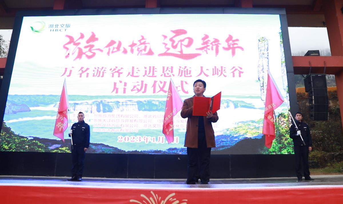 恩施州文旅局党组书记、局长邵爱华宣布活动正式启动。恩旅集团党委副书记、总经理田科伟致欢迎辞,他表示在新年第一天,“万名游客走进恩施大峡谷”活动正式启动,旨在通过此次活动诚邀四海嘉宾一起行恩施旅游之路,听千古传唱,赏峡谷佳景。