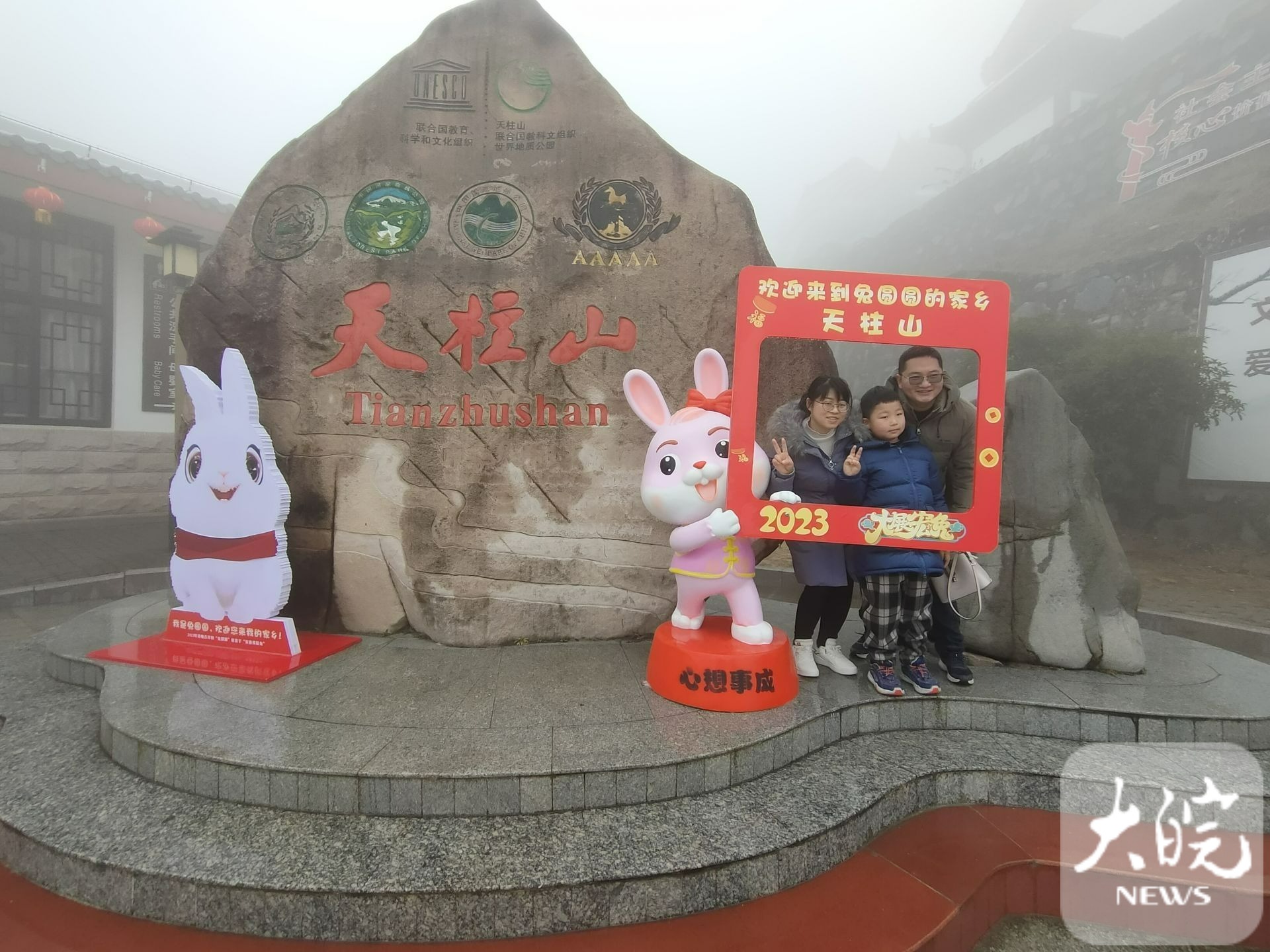 春节假期,天柱山风景美,年味浓,景区在马祖、茶庄游客中心、天池峰等多处设有欢庆新年的“兔圆圆”卡通形象,游客在这里拍照,许下美好愿望。“今年春节带着家人在天柱山旅游过年,提前在网上预订好民宿,一家人开心快乐地体验山岳风情,吃农家菜、看民俗、滑冰雪、赏美景,体验“慢生活”,在“兔圆圆”故乡过兔年,意义非凡。”来自上海的余先生开心地说。