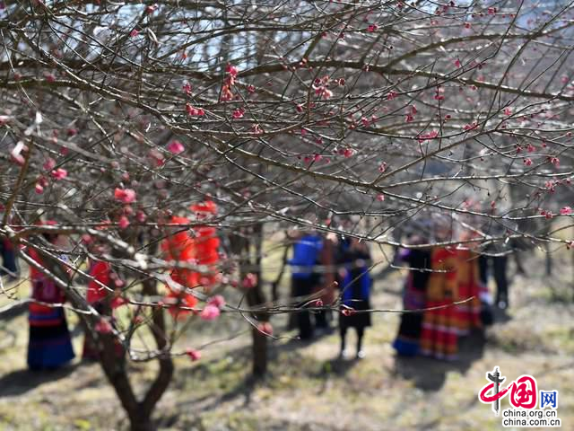 近500亩绽放的红梅花与丰富多彩的彝族歌舞、苗族芦笙舞交相辉映,吸引众多游客陶醉其间留连忘返。