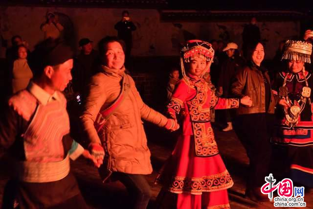 1月30日,在百里杜鹃管理区普底乡永兴村的篝火旁游客与彝族群众跳起欢快的舞蹈。