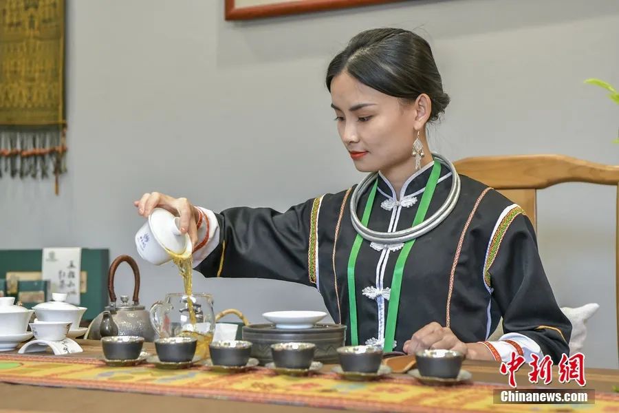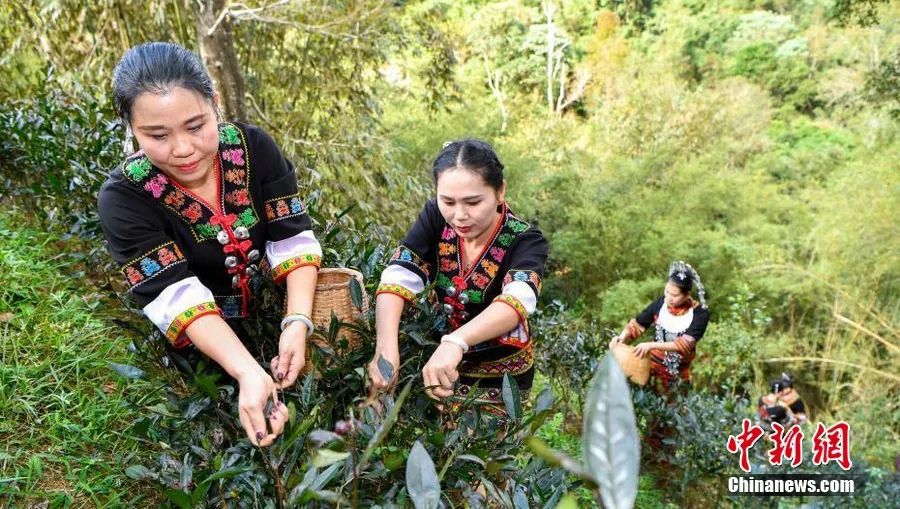 身着黎族服饰的黎族姑娘采茶。骆云飞摄