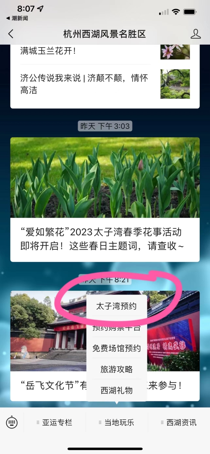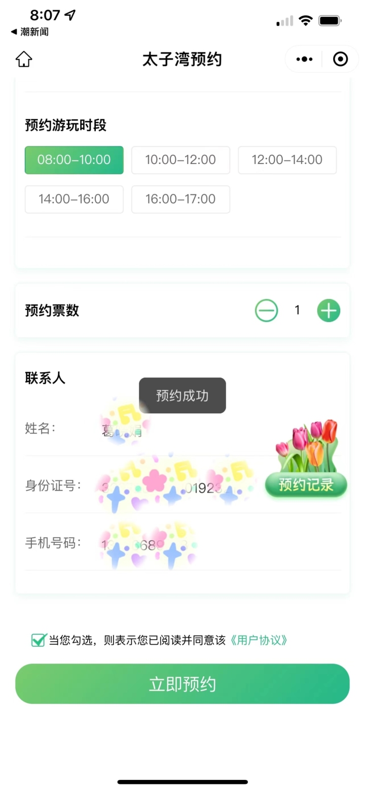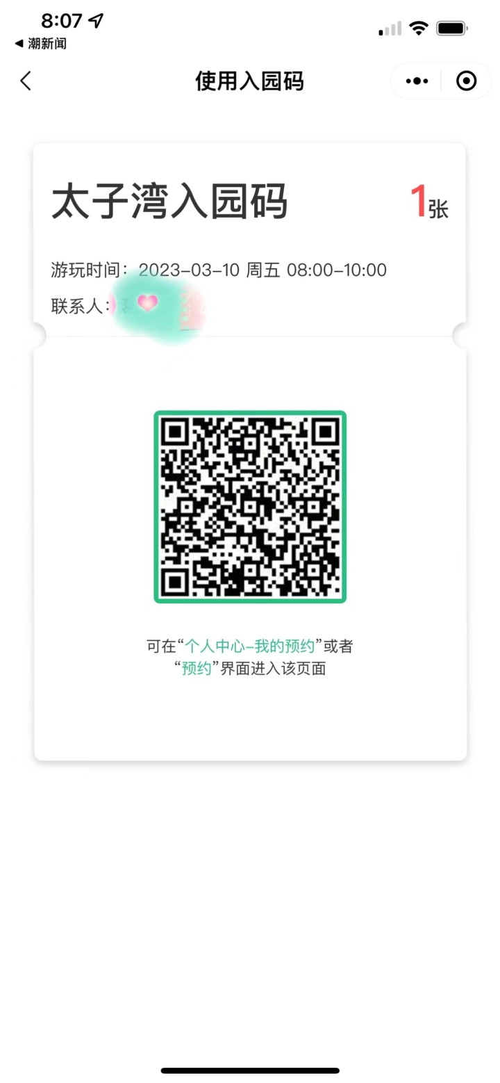 很快就跳出“太子湾预约”的字样。根据提示操作后,大概1分钟多中,就拿到了周五上午8点到10点的预约码。