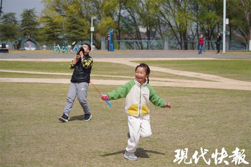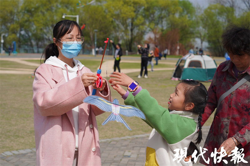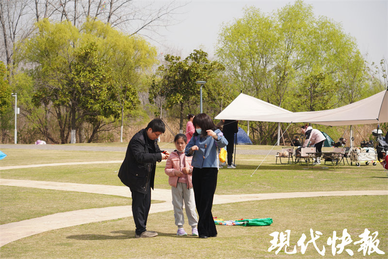 嫩绿的草地上,南京市民沈虹和朋友们刚刚搭好两个帐篷,放风筝是他们此次游玩的重要环节。“鱼嘴这里风景好,空气清新,那边还有湿地,我们就想带小孩来放放风筝。”说着拿出自己从网上买的风筝——一只巴掌大的小鸟,快跑几步,风筝便随着风飘动起来。沈虹把飞起的小风筝交到女儿手上,颤动着翅膀的小鸟,让她瞬间成为周围小孩羡慕的对象。“爸爸,你快看,她的风筝小鸟翅膀还会动!”孩子们在草地上跑着、追逐着。