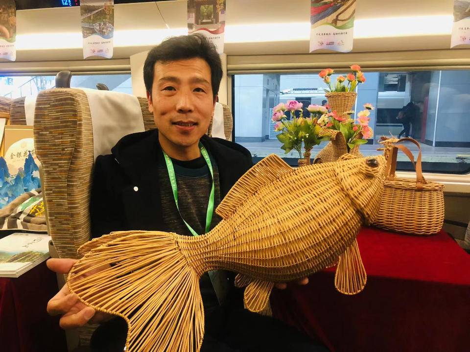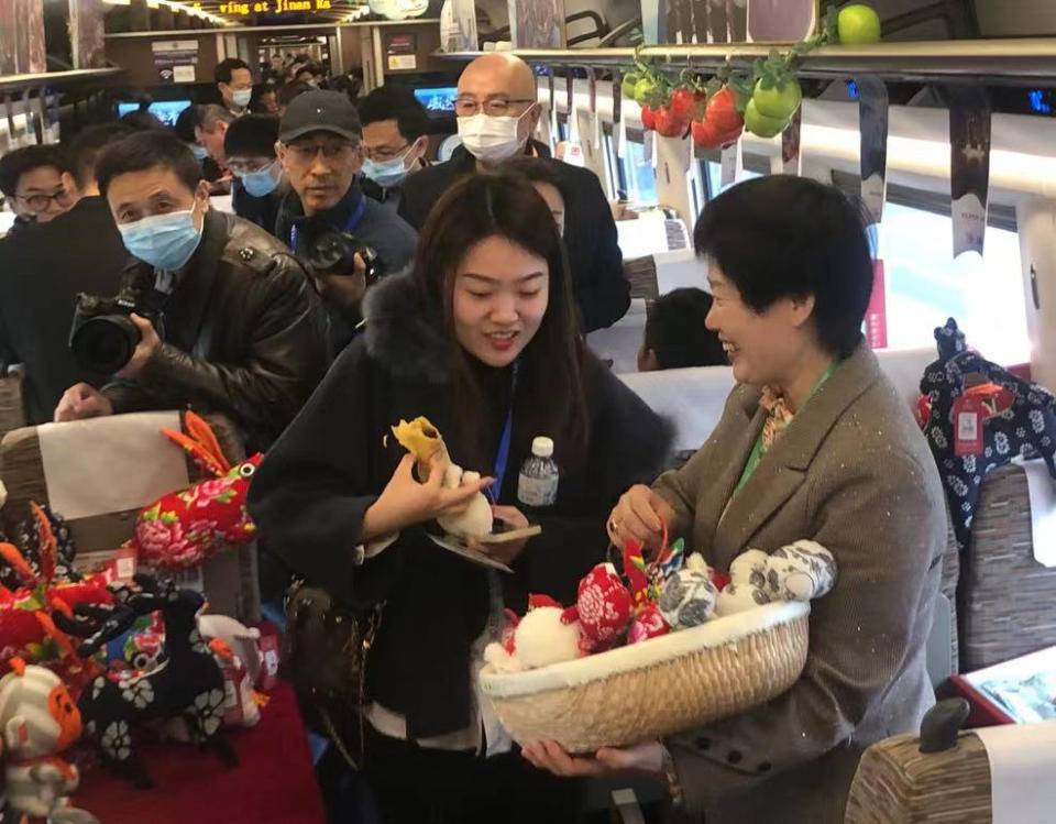 在高铁车厢内,除了装饰有沂蒙元素的地标景点及网红景区,像热门景点如蒙山、孟良崮纪念馆、竹泉村等广为人知;临沂非物质文化遗产传承人现场展演的手秀、柳编、沂蒙布艺等也深受游客喜爱。