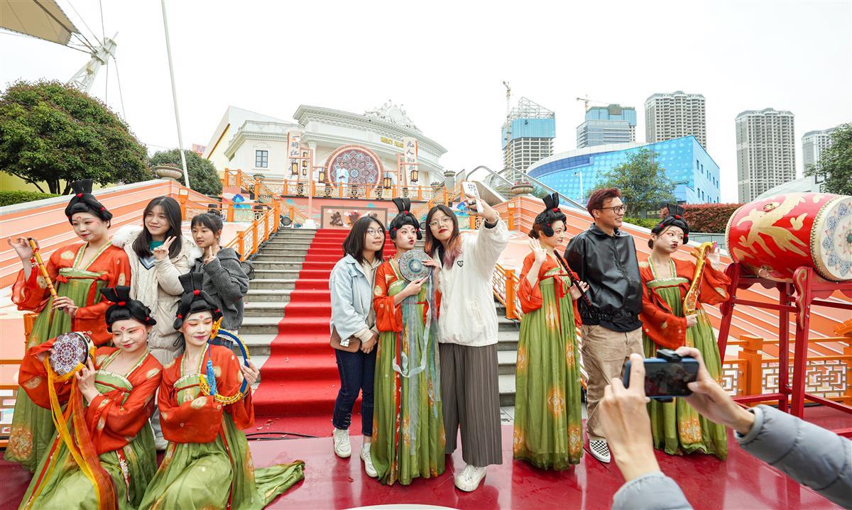 3月24日下午3点,风靡全网的“唐宫夜宴国风演出”在武汉欢乐谷花萼楼华丽上演,一群梳着高髻、身着黄绿红三色衣裙的唐宫小姐姐时而嬉笑打闹,时而梳妆打扮,时而严肃,时而活泼,生动地演绎了千年之前唐朝仕女赴宴演奏的精彩趣事。现场有许多游客是慕名而来观赏“唐宫夜宴国风演出”,有家长还特地把萌娃打扮成唐朝小仕女的模样,活泼可爱的形象吸引了不少围观游客合影。