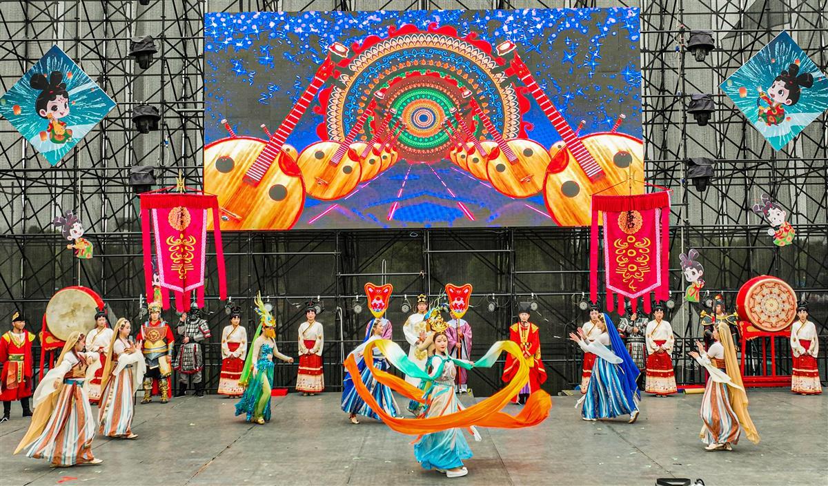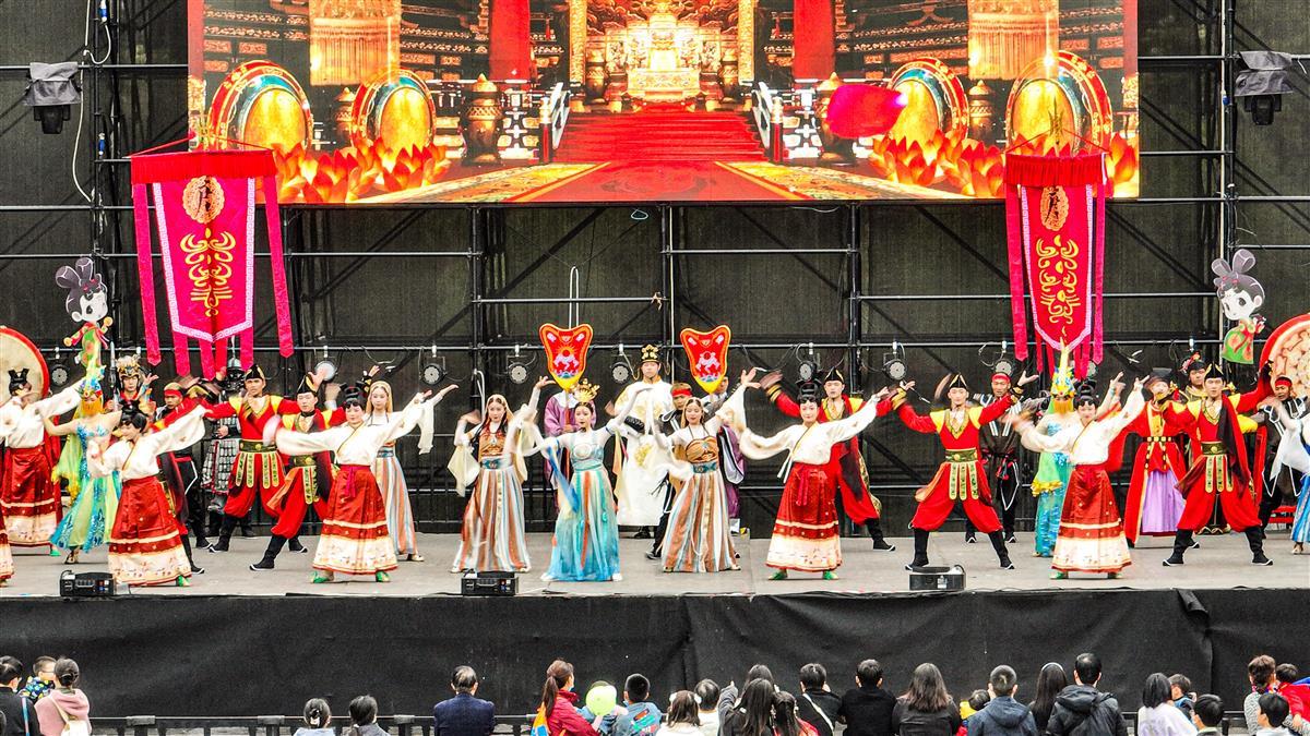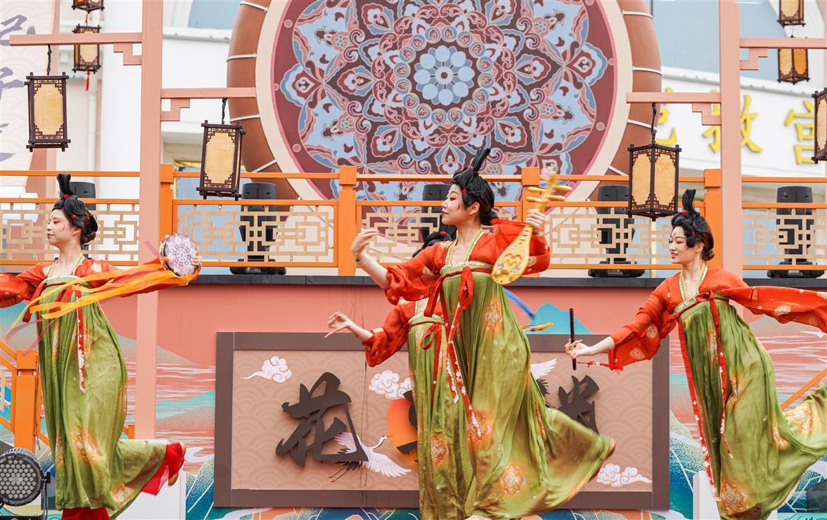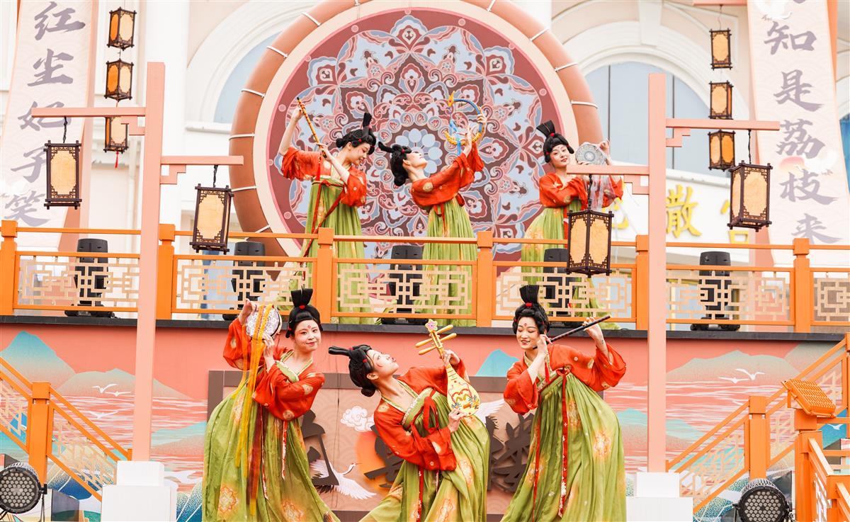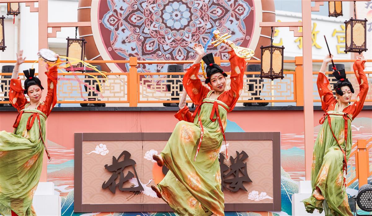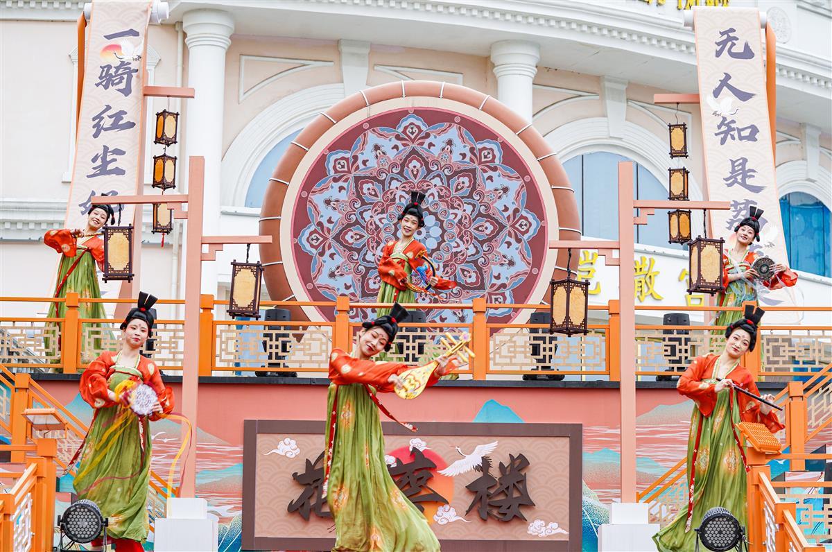 今日首次登场的“霓裳羽衣舞”也在花萼楼中上演,花萼楼是武汉欢乐谷专为沉浸式演艺打造的古风场景,画栋楼台配合古风乐舞,将沉浸式穿越之旅的氛围直接拉满。一舞霓裳歌太平,贵妃在仕女舞步引领下惊艳亮相花萼楼,献上令众人沉醉的国潮演出。这种场景式互动演艺是唐宫华彩节对国风文化和互动演出的一次创新融合,让游客以更轻松有趣的方式来解读传统文化内涵,领略文化旅游的无限魅力。