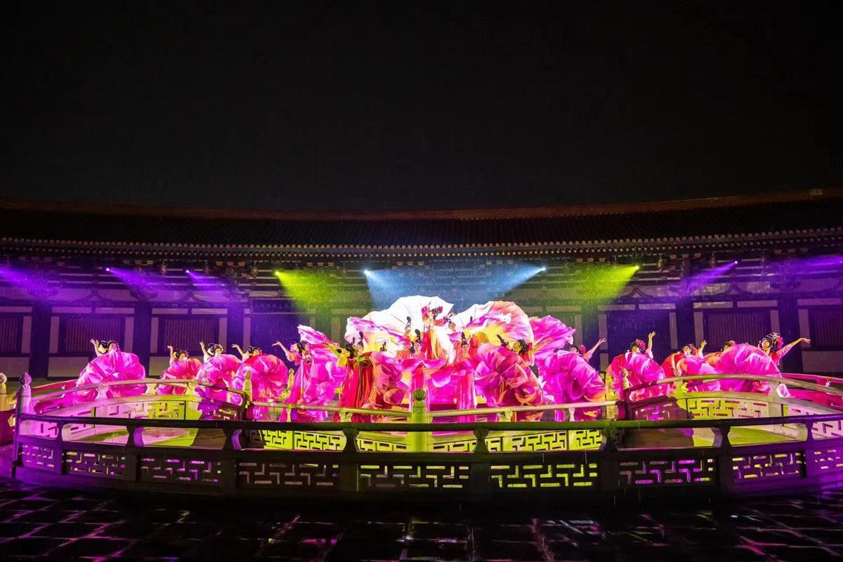 在“长安丽人”的翘首期盼之下,出征的“将军”凯旋而归,《明德奏凯歌》盛迎八方宾客;大型舞蹈《朱雀展国威》再现了“冲天香阵透长安,满城尽带黄金甲”的盛唐泱泱大国之国威;《佛光普照颂》结合灯光与音乐的现代科技,多维度呈现了古典美与现代科技感的禅意文化;而《盛世牡丹赋》则展现出“唯有牡丹真国色,花开时节动京城”的婀娜艳丽与华贵优雅……各种演出中,诗化的舞蹈语言,唯美的舞台设计和音乐,以及霓虹斑斓、水光潋滟的各色光影秀,成就了一幅“此景只应天上有”的绝美画卷。