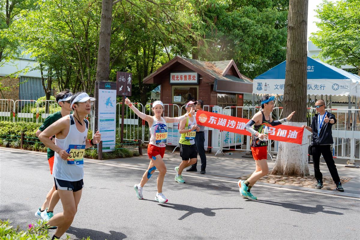 极目新闻记者在现场看到,在31公里磨山景区北门处,LAYA乐队将在此高歌助力;33.5公里东湖绿道东湖氦气球露营草坪处,有DJ在此嗨唱;35.3公里东湖绿道音乐小站处,有小提琴乐曲悠扬;35.5公里九女墩处,有吉他为选手弹奏……跑友们沿途在水月亭听到楚剧演出,在湖光序曲广场途经黄梅戏演出等,精彩纷呈。