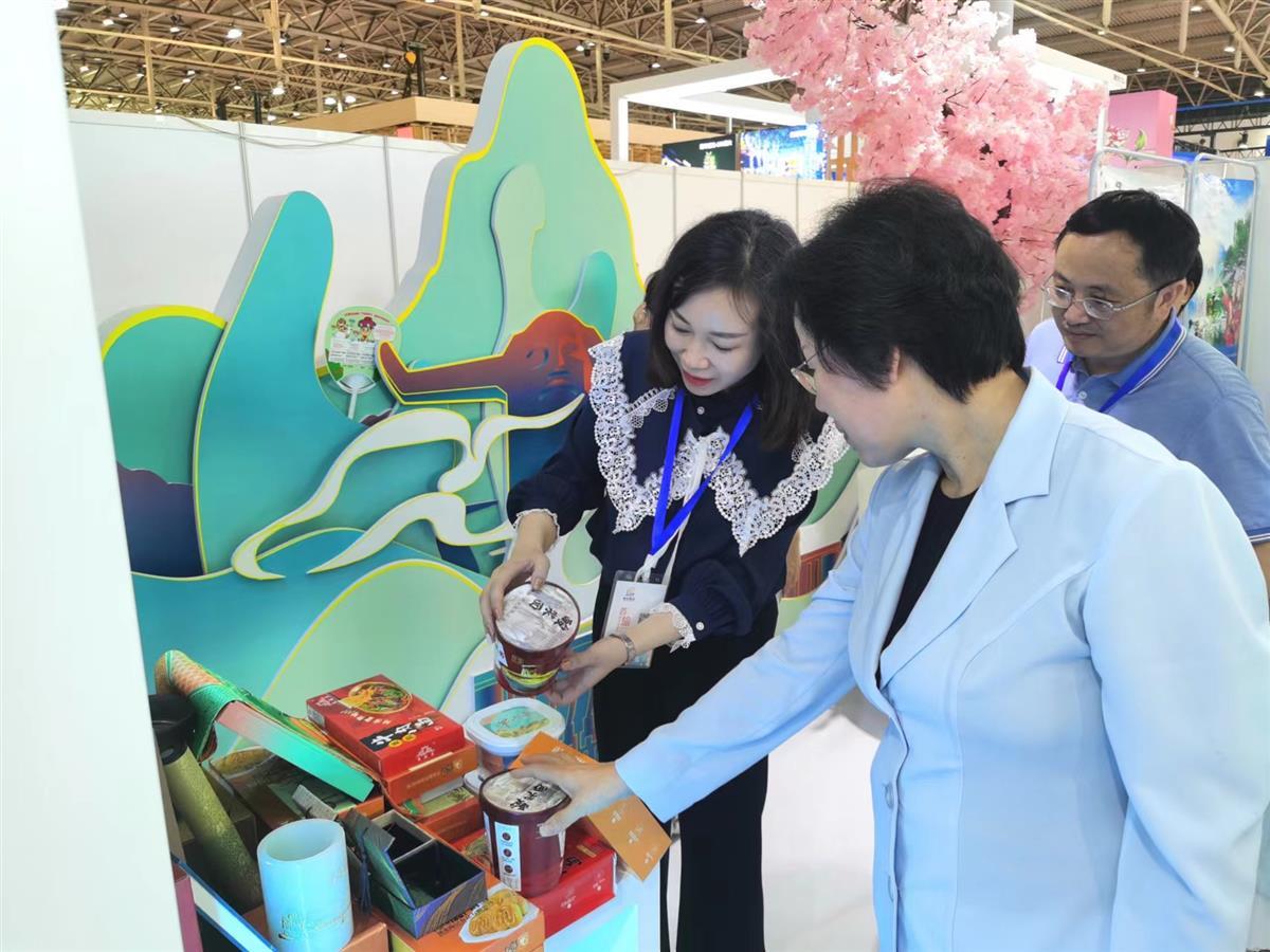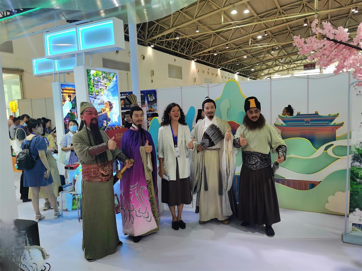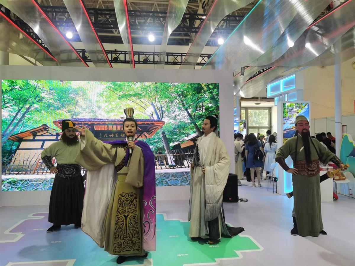 展会现场,襄阳市文化和旅游局精心挑选了手工刺绣丝巾、襄阳牛肉面、研山铭、隆中对真丝织锦、漆器耳杯、琉璃笔筒等众多旅游商品进行展示。襄阳古隆中景区带来的IP人物刘备、关羽、张飞与诸葛亮现场演绎《三顾茅庐》,节目将观众带回风云突变的三国时期,将现场推向高潮,吸引大量游客以及外国友人前来驻足观光,合影留念。