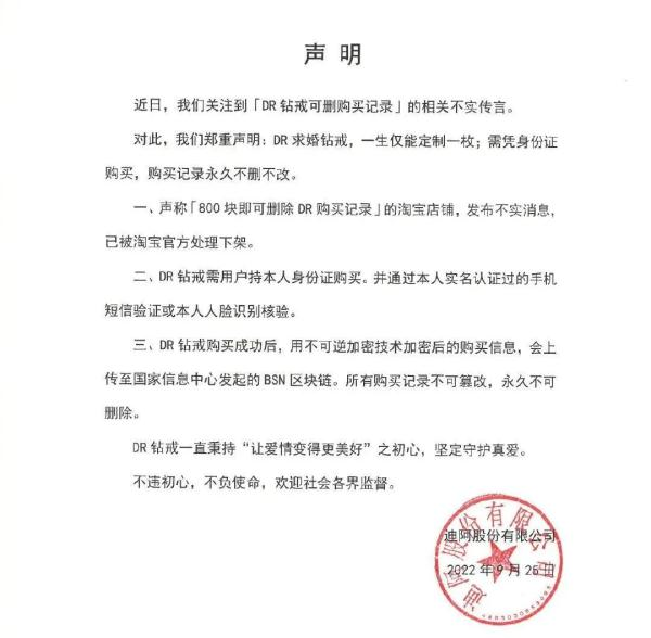 2022年9月25日,DR钻戒曾发布官方声明对此进行回应。官方声明称,“DR钻戒可删购买记录”为不实传言,发布不实消息的淘宝店铺已被淘宝官方处理下架。据DR方面介绍,此类“淘宝店”非DR官方旗舰店,是假冒门店欺诈消费者,目前涉事商家已被警方以诈骗罪立案侦查。