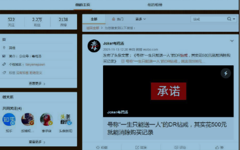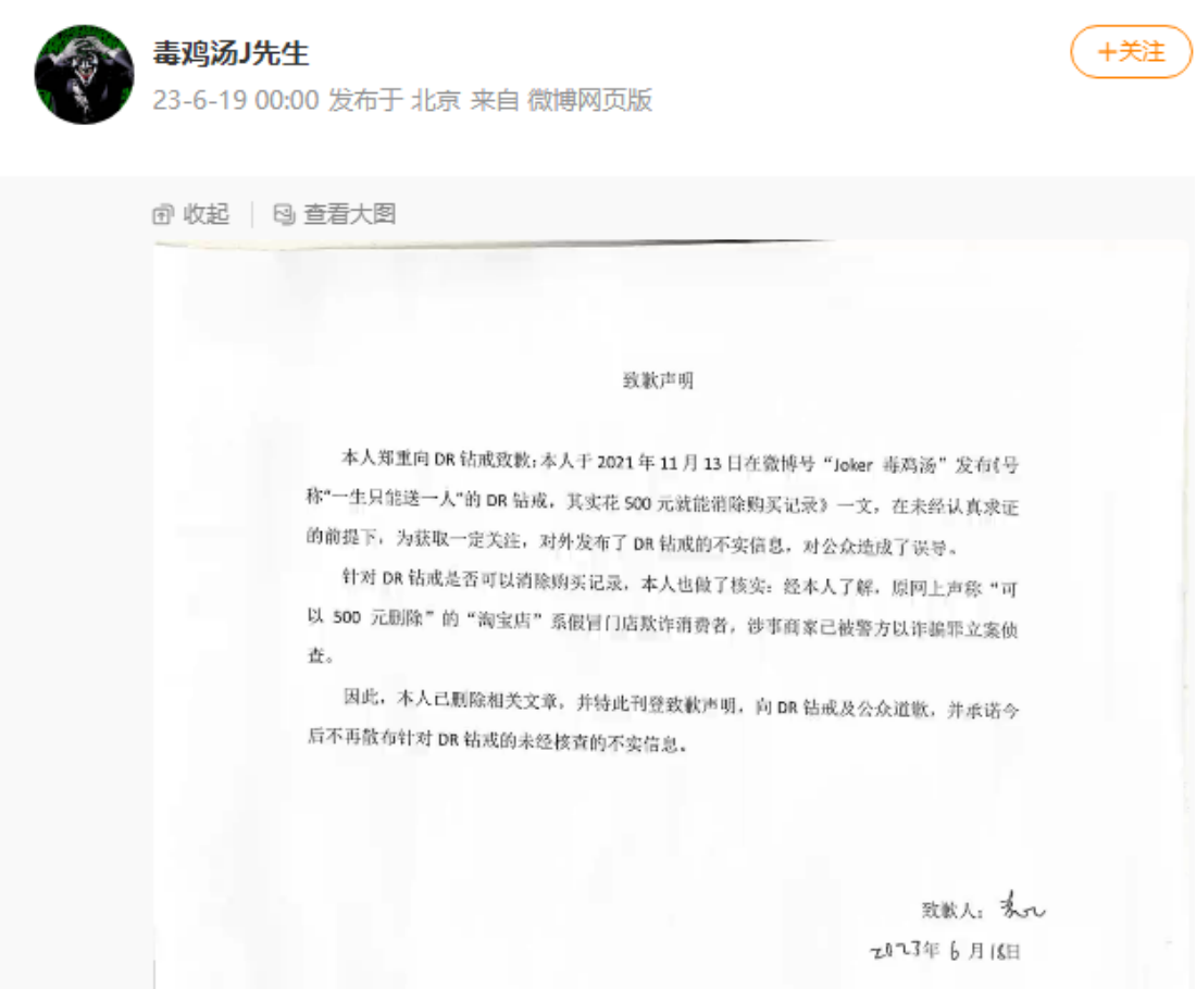 6月19日零点,自媒体博主@毒鸡汤J先生在微博上发布了一则公开道歉声明,表示自己为获取一定关注,未经认真求证就于2021年11月13日对外发布《号称“一生只能送一人”的DR钻戒,其实花500元就能消除购买记录》文章一则,对公众造成了误导,特此刊登致歉声明,向DR钻戒及公众道歉。其本人已删除相关文章,并承诺今后不再散布针对DR钻戒的未经核实的不实信息。