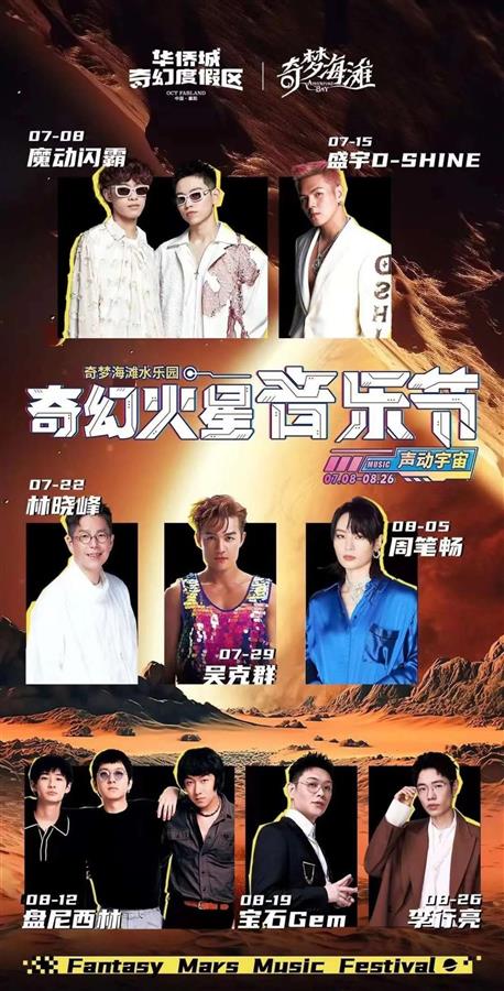 魔动闪霸、盛宇D-SHINE、林晓峰、吴克群、周笔畅、盘尼西林、宝石Gem、李行亮8大超强明星阵容重磅集结、火热开唱,汇聚流行音乐、民谣、摇滚、Hiphop等多种音乐风格,用音波造浪,为广大游客献上今夏最潮流、时尚的音乐盛典。