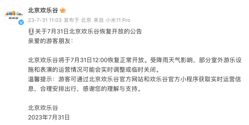 据@北京欢乐谷消息,北京欢乐谷将于7月31日12:00恢复正常开放。受降雨天气影响,部分室外游乐设施和表演的运营情况可能会实时调整或临时关闭。