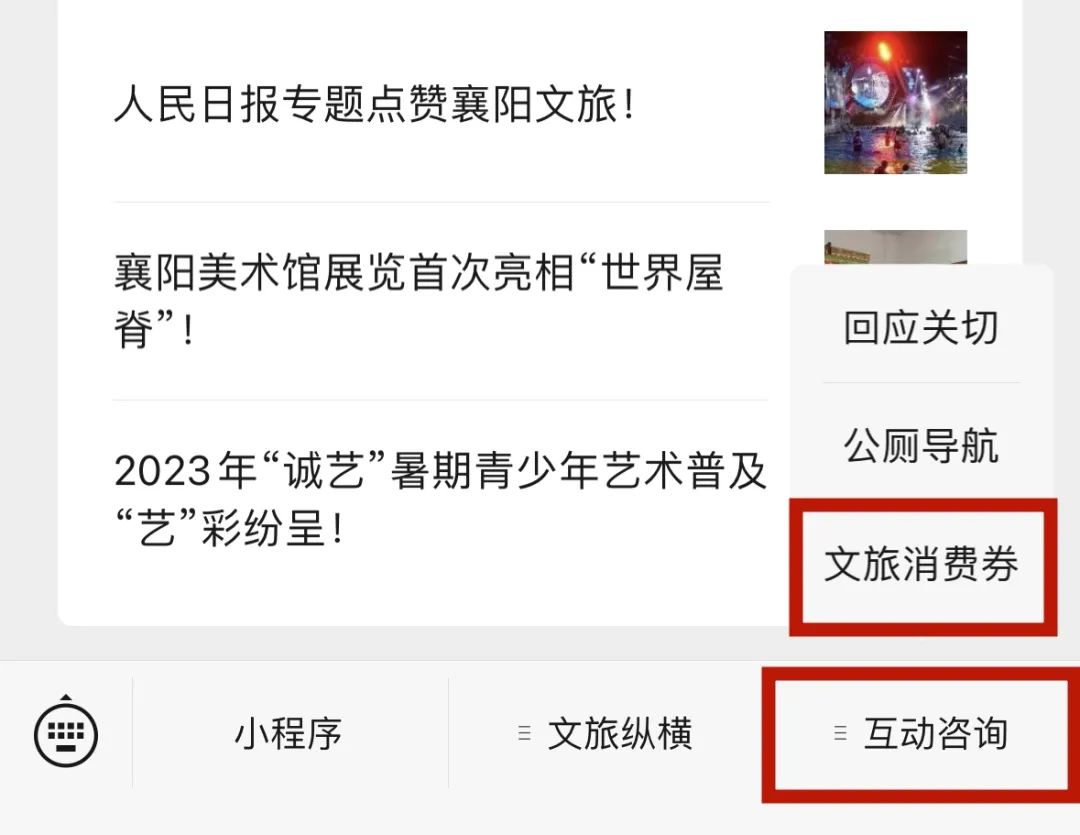微信小程序平台:在“襄阳文化旅游”微信公众号主页,点击“发消息”,选择“互动咨询”-“文旅消费券”,进入“襄阳好风日”消费券小程序,在活动前完成实名认证后,按照指引领取;