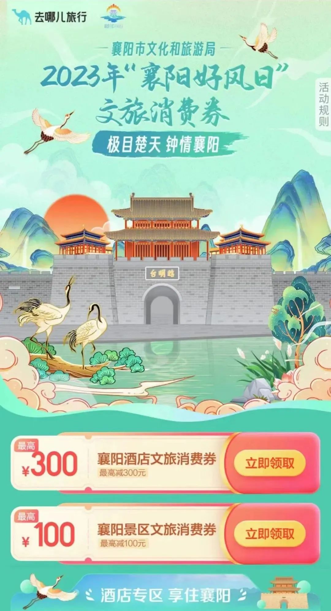 去哪儿旅行APP:进入去哪儿旅行APP主页面,搜索襄阳文旅消费券,进入领券页面抢券;