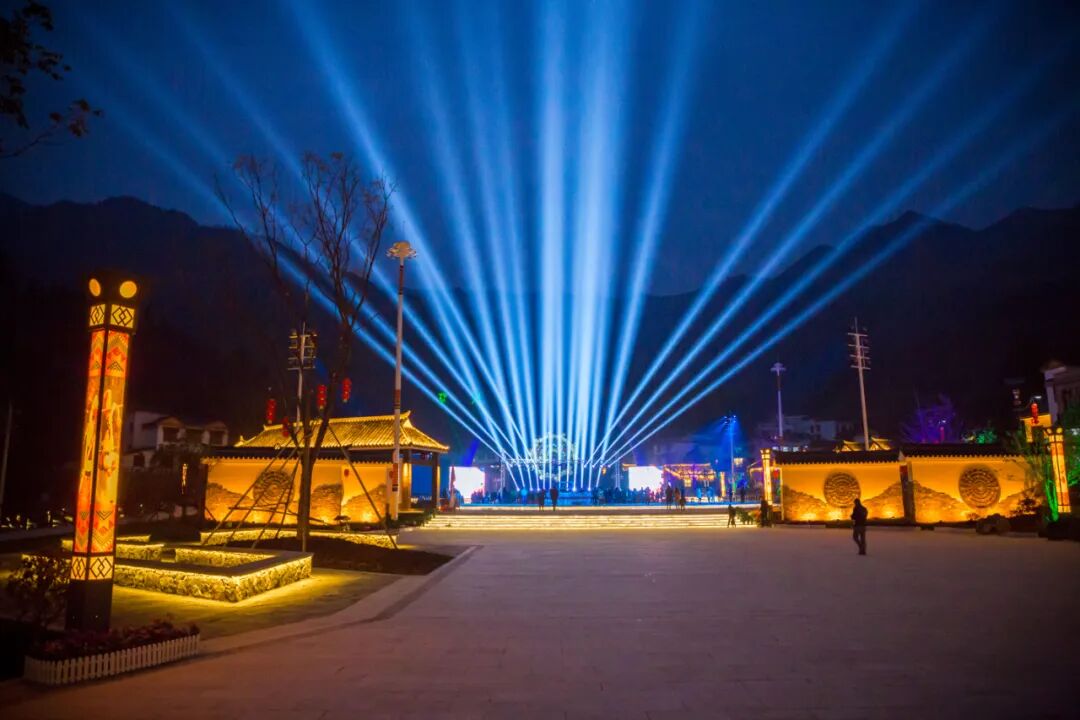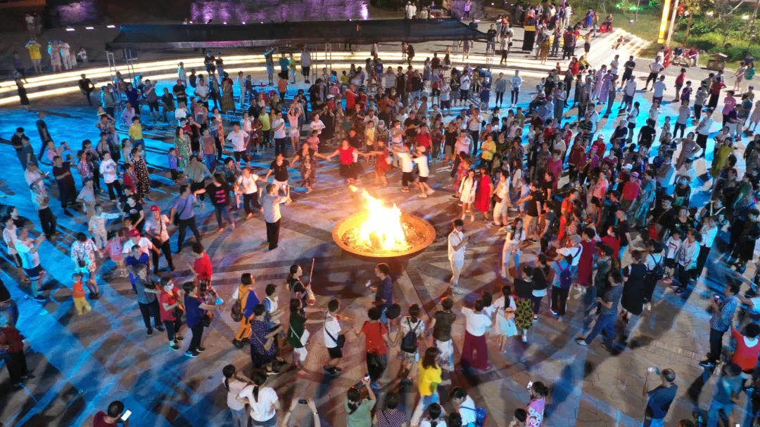 到了晚间,瑶望千年广场上点起篝火,人们在火堆旁跳起节奏欢快的拍打舞,或是开设灯光秀,引得一片欢呼雀跃。