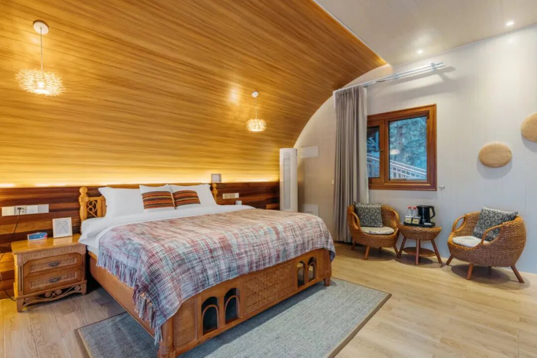 民宿设有5款别墅房型,都十分有特色:观景别墅、裸心别墅、观止别墅、萌萌屋别墅、养心别墅,房间内采用落地窗设计,360°森林观景,配备有电动窗帘等智能家居,真正做到了与山水同眠,白天观晨雾,晚上看星星。