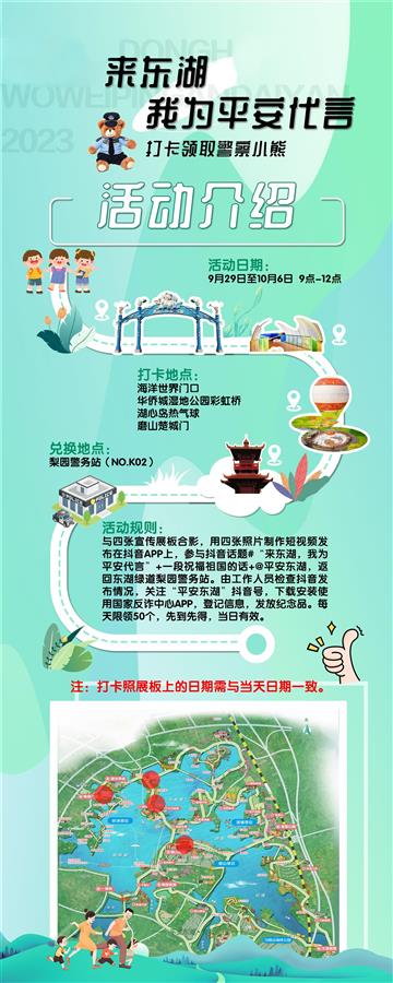 活动将在东湖绿道梨园广场入口设置活动宣传简介及打卡点定位地图,东湖海洋世界门口、华侨城湿地公园彩虹桥、湖心岛热气球、磨山楚城门四个场景分别设有禁毒、反诈、消防、文明养犬等宣传打卡展板,在四处打卡点的宣传展板前合影,并通过抖音个人账号将四张照片编辑成视频发布内容,配合文案:#来东湖我为平安代言+一段祝福祖国的话+@平安东湖,关注“平安东湖”官方平台账号,下载安装使用“国家反诈中心APP”即可完成打卡任务,前往兑换点免费领取警察小熊一个。每天限量50个,先到先得哦!
