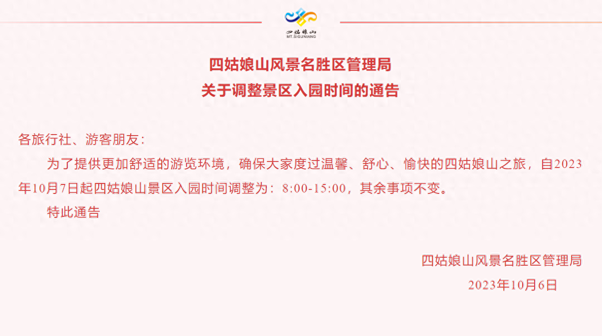 10月6日,四姑娘山风景名胜区管理局发布关于调整景区入园时间的通告: