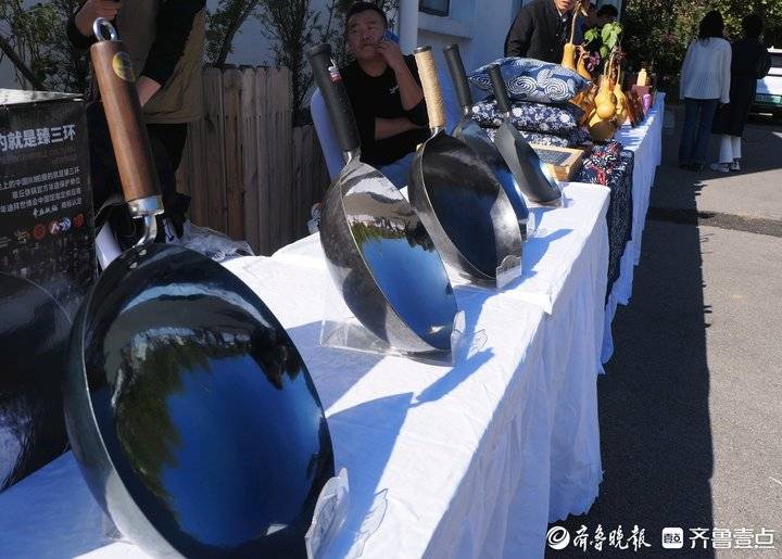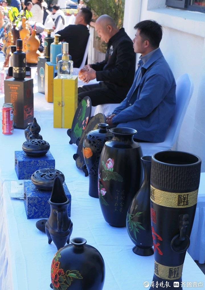 活动现场一批富有章丘特色的“手造”产品悉数亮相:龙山黑陶、章丘铁锅、葫芦雕刻、黄家烤肉、百脉泉酿酒等17类非遗产品。