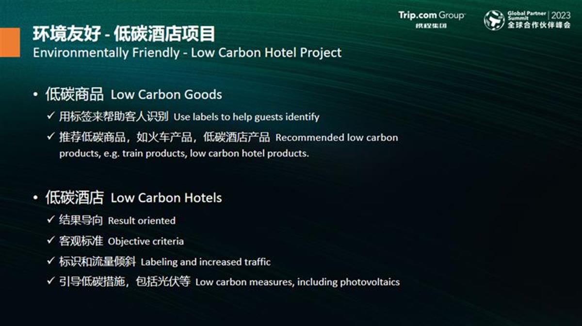 2023年10月24日,携程在新加坡·圣淘沙岛举办全球合作伙伴峰会,推出“携程低碳酒店标准”。相比目前的行业标准,该标准具备可量化、可检测、可提升等显著特征。