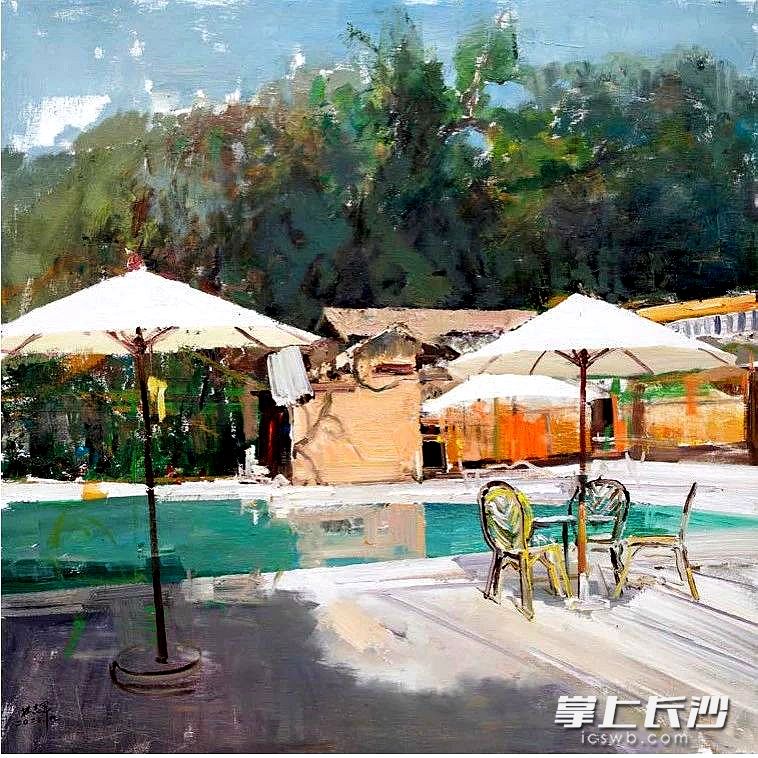 在望城区,画家们取景描绘铜官五号山谷无边泳池、乡村田间五彩塑胶健身道;在浏阳,白沙古镇浏河村舍咖啡吧,则展现的是古镇乡村的未来美好图景。
