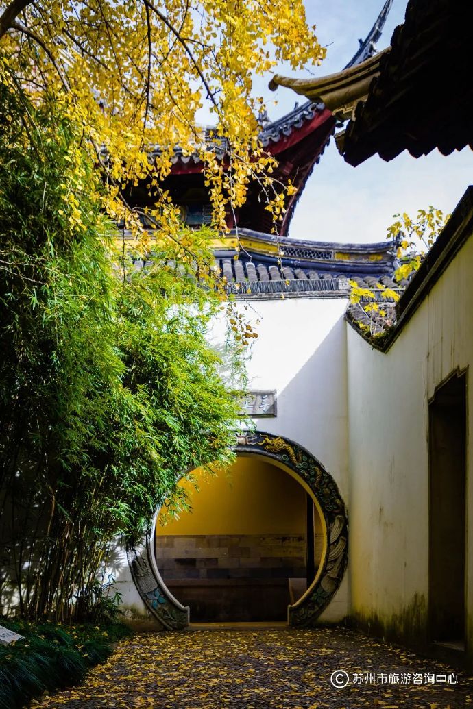 西园寺内银杏树与寺院的黄墙黑瓦构成独特的一景,这里的银杏树枝繁叶茂,灿烂的金黄色遮天蔽日,明晃晃的暖意,流动在眼前,也温暖在心间。