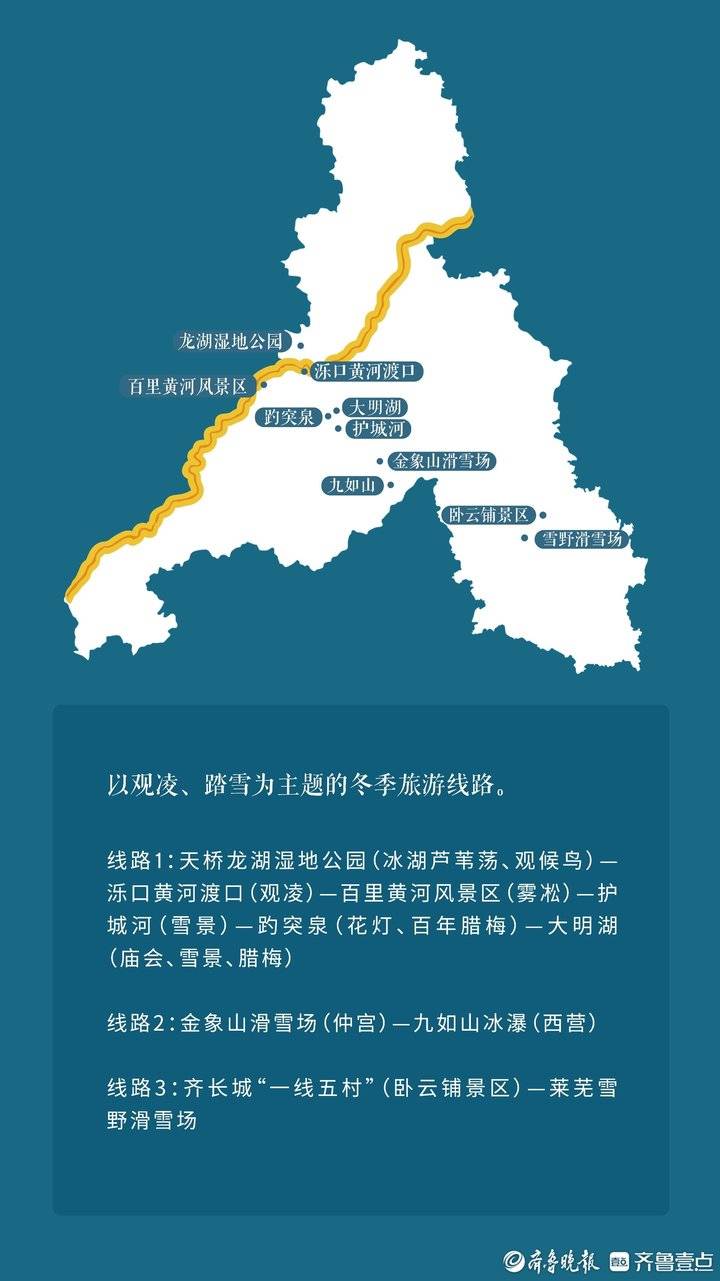 线路1:天桥龙湖湿地公园(冰湖芦苇荡、观候鸟)—泺口黄河渡口(观凌)—百里黄河风景区(雾凇)—护城河(雪景)—趵突泉(花灯、百年腊梅)—大明湖(庙会、雪景、腊梅)