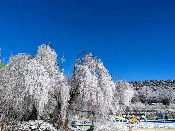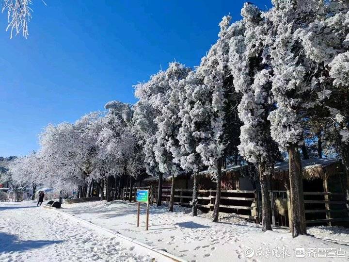 高空俯瞰,跑马岭俨然成了隐于南山中洁白无瑕的冰雪王国;近观齐鲁雪乡处处玉树琼枝,雪柳银花,粉妆玉琢,每株植物仿佛都变成了形态万千的白色珊瑚,令人叹为观止。