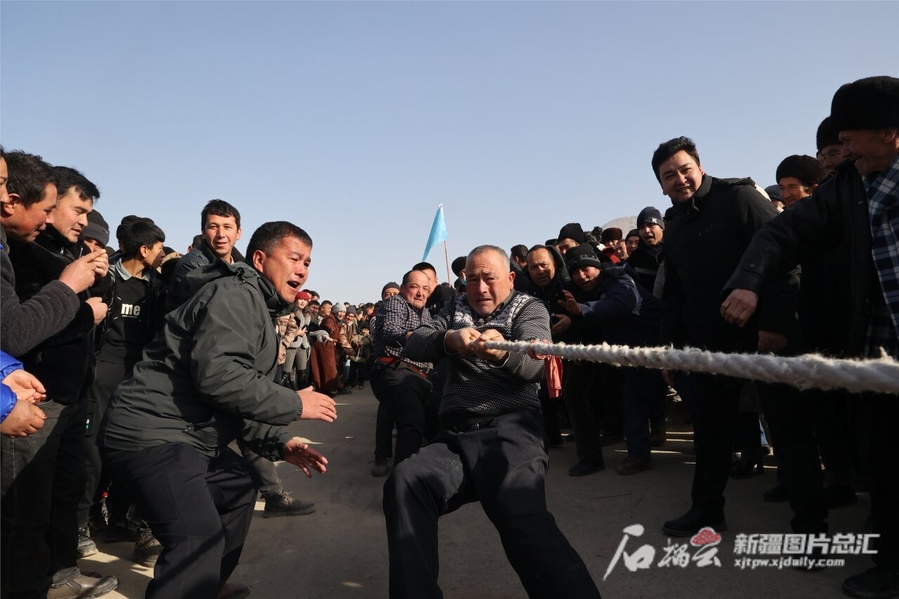 12月24日,游客和当地群众在乌什县泉域星空国际滑雪场参加拔河比赛。外力·克依木摄