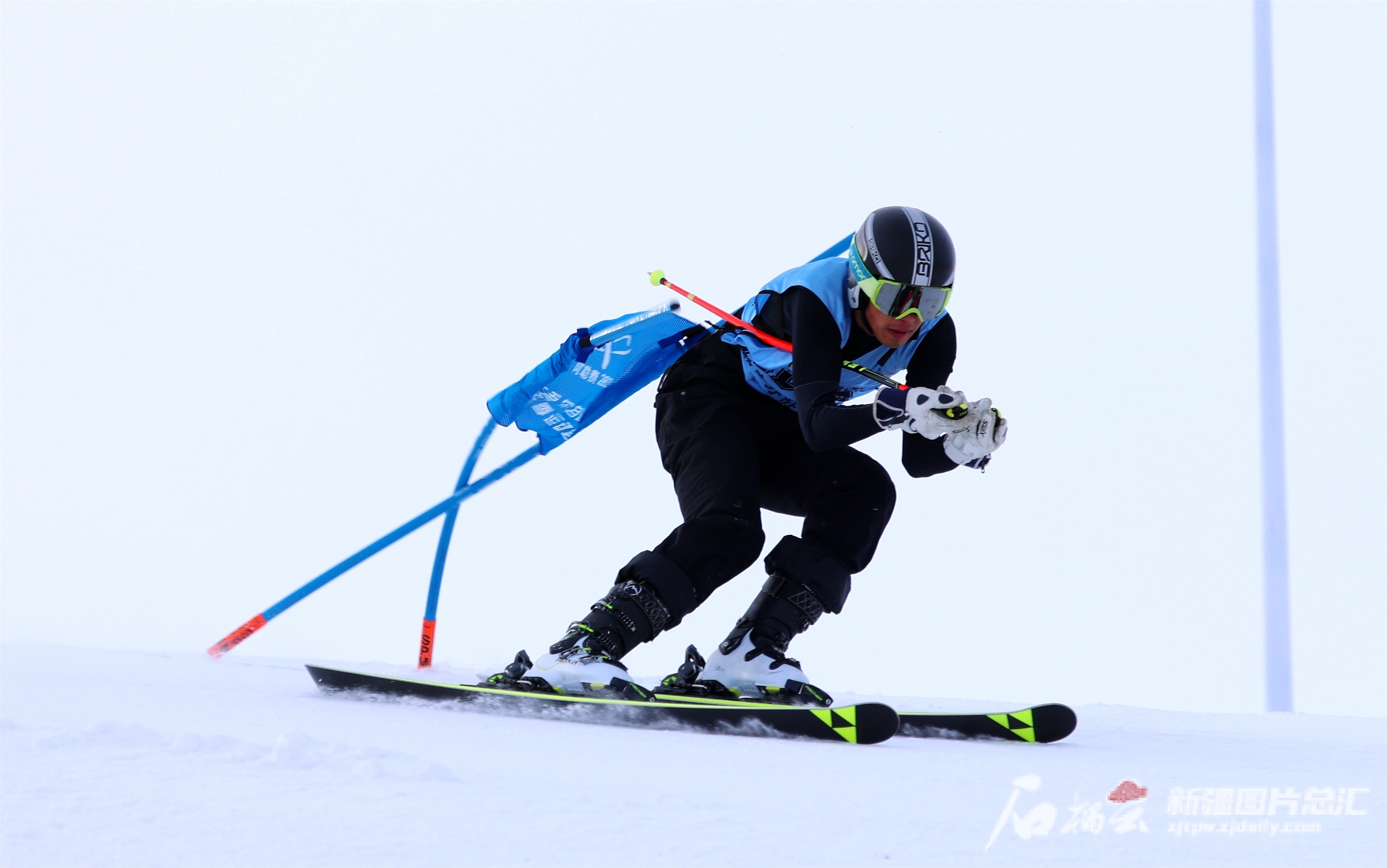 12月25日,在阿勒泰将军山国际滑雪度假区,2023-2024吉林国际高山/单板滑雪挑战赛阿勒泰分站赛选手在比赛中。阿尔达克·拜斯汗摄