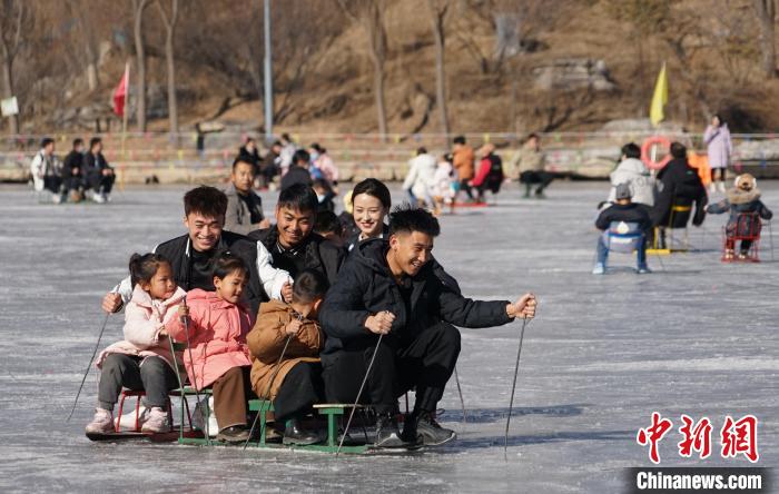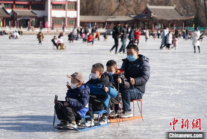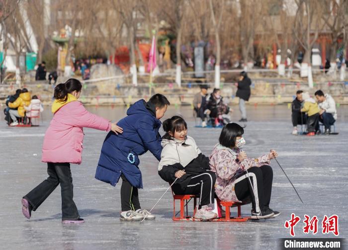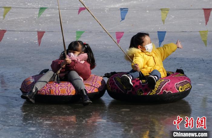 图为民众在西宁市人民公园滑冰场坐冰车享冰趣。 马铭言 摄