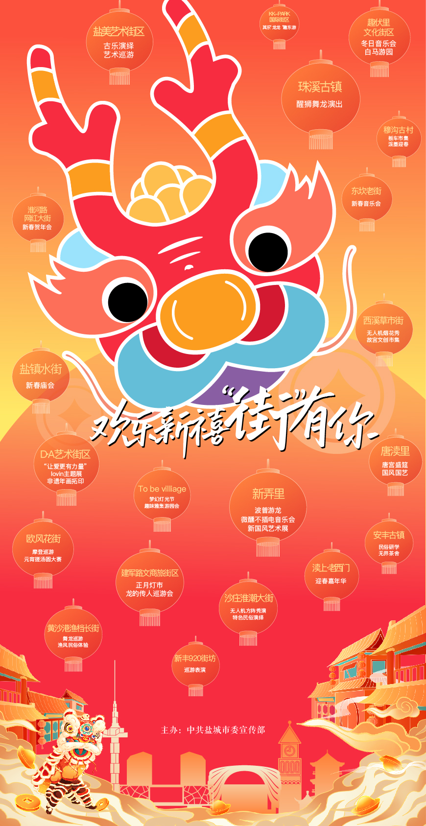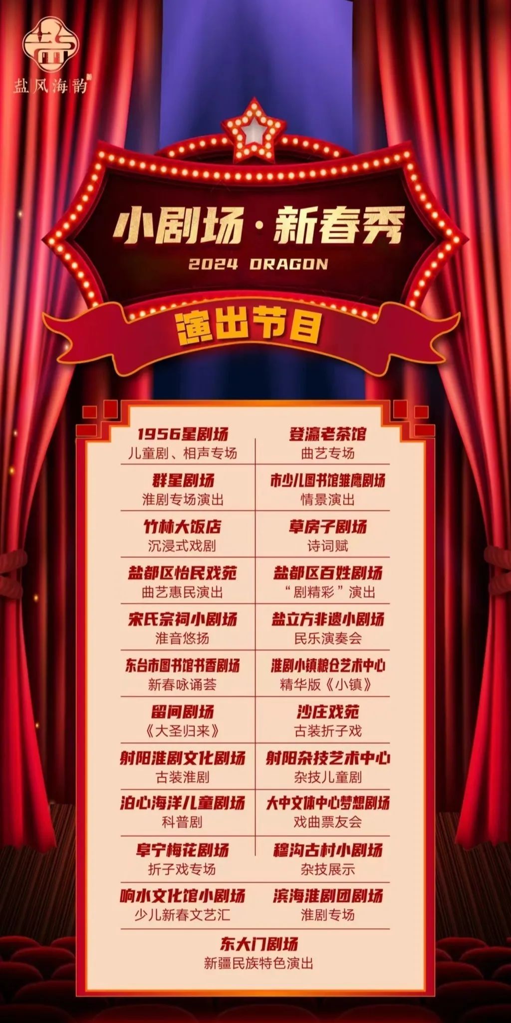据悉,今年春节,盐城西溪天仙缘景区将推出迎新纳福篝火烟花秀、“仙缘福地 龙腾西溪”新春灯会等活动;大纵湖旅游度假区将推出“千年雅宋,长街集市”等活动,带你穿越宋朝过潮年;盐城市博物馆将开展盐引疑云探秘游、数字导览情境游和国潮百戏、盐韵雅集等文化互动体验;东台市黄海森林将筹备开展“森晚”表演与互动游戏……此外,还有街区新禧、剧场竞秀等特色节目,市民与游客可关注盐城文旅公众号获取更多活动及表演信息。
