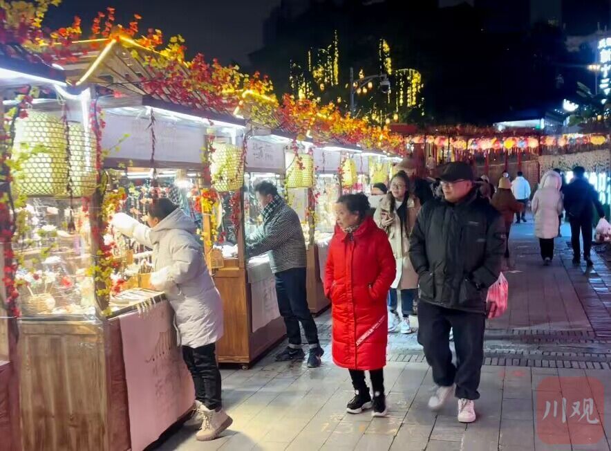 东门码头上,一个个摊位摆了起来,重现东门集市的场景。在这里,游客们可以购买手工制品、租借汉服、品尝美食。春节临近,集市上还有贩卖各种花灯的摊位,更有卖家现场为游客手写春联。
