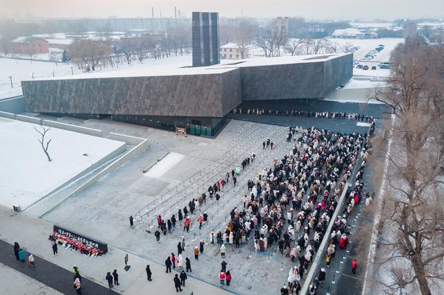 1月25日,游客在侵华日军第七三一部队罪证陈列馆入口排队等候参观(无人机照片)。新华社记者 谢剑飞 摄