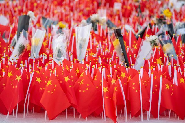 这是1月25日拍摄的游客在侵华日军第七三一部队遗址的一片雪地中所插的国旗和鲜花。新华社记者 谢剑飞 摄