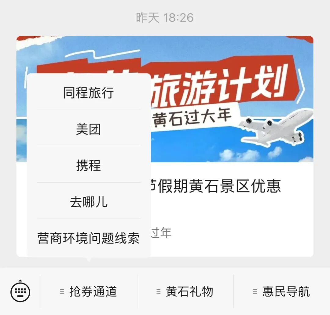 第二步,点击菜单栏左侧的“抢券通道”,可以看到同程、美团、携程、去哪儿四个抢券平台,任选其一点击,即可进入“极目楚天 钟情黄石”文旅消费券活动