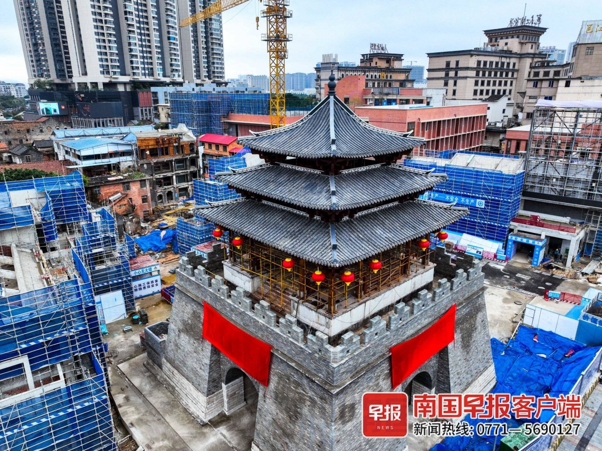 最近,路过南宁市中山路口的市民会发现,南宁重磅级文旅地标——钟鼓楼已基本建成,东西南北四个大门门匾上挂着红布,楼上悬挂着红灯笼。2月6日,记者采访业主方获悉,钟鼓楼将于2月8日晚举行亮灯仪式,500年前建成、消失了近百年的钟鼓楼将重现雄姿。