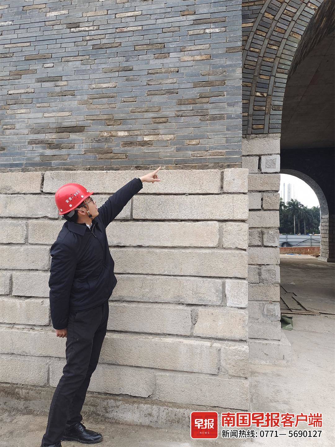 ▲施工方指着一块旧青砖介绍墙身的结构。记者 雷小琴 摄