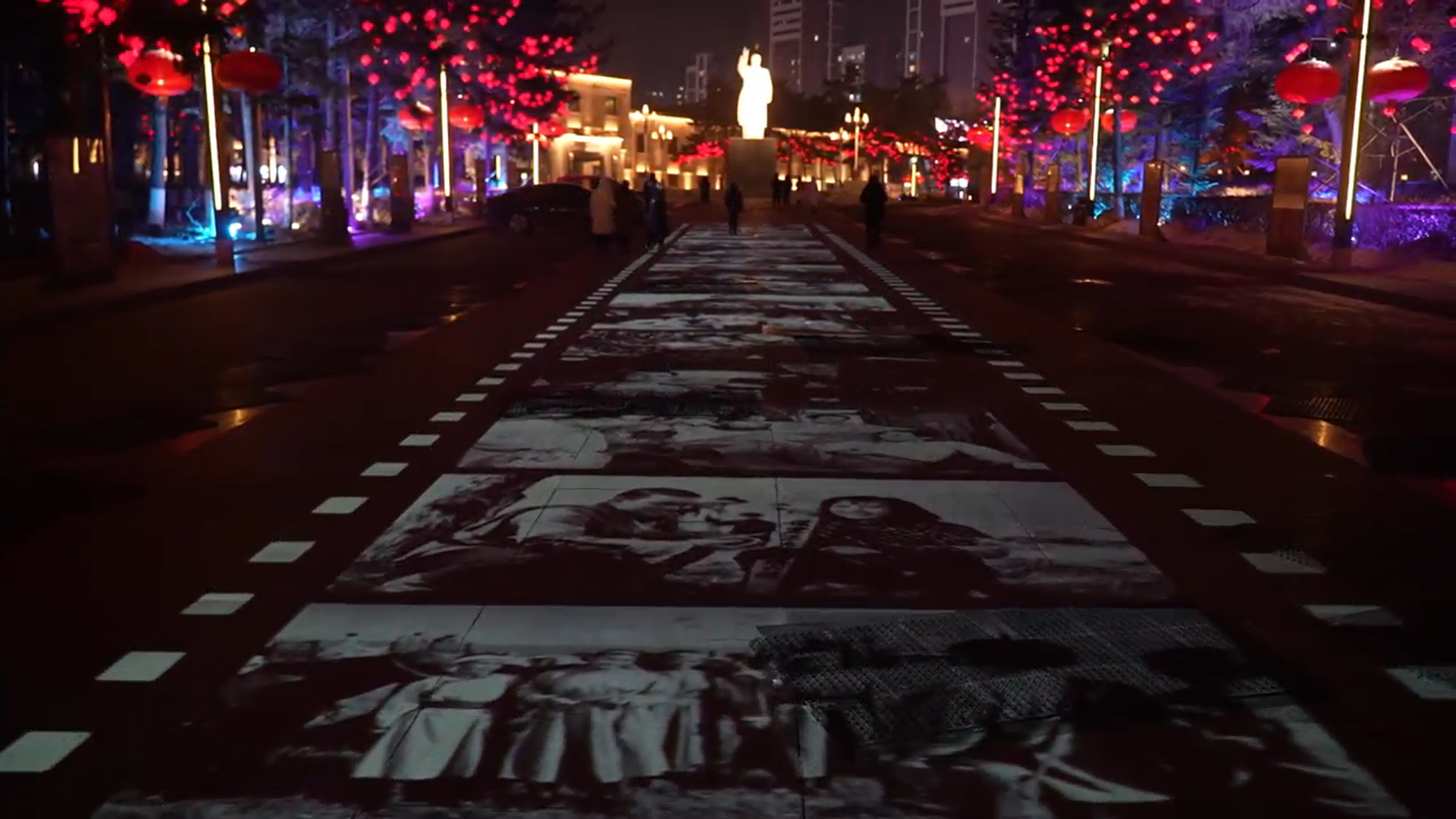 在长史大道上,激光投影机在地面上打出黑白相间的剧照图片,仿佛将人们带入时光的隧道。游客们穿越其中,仿佛漫步在历史的长廊,品味着岁月的沧桑与伟大时代的波澜壮阔。