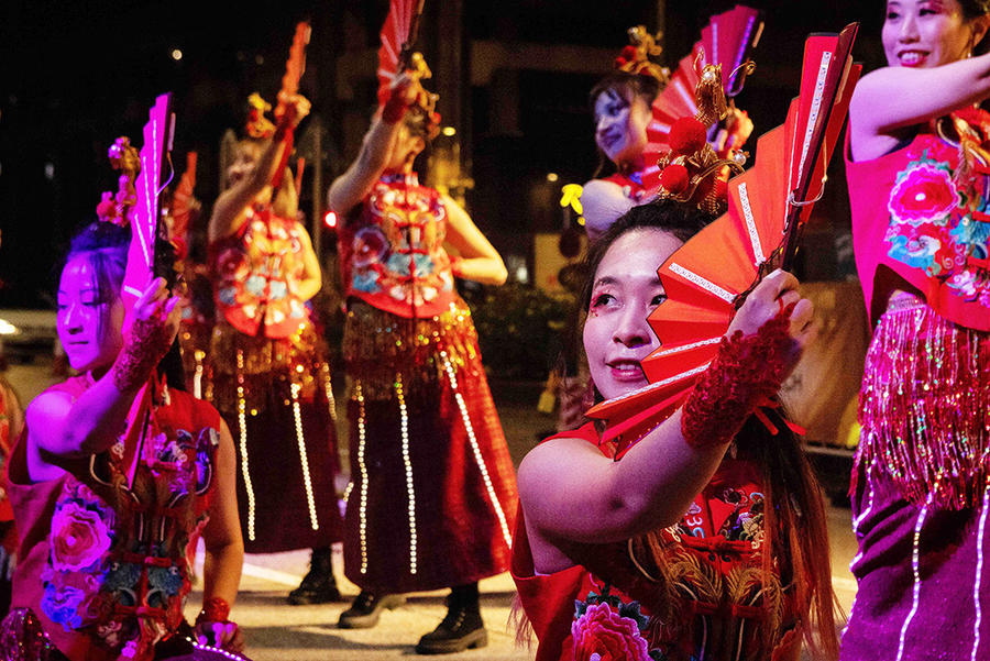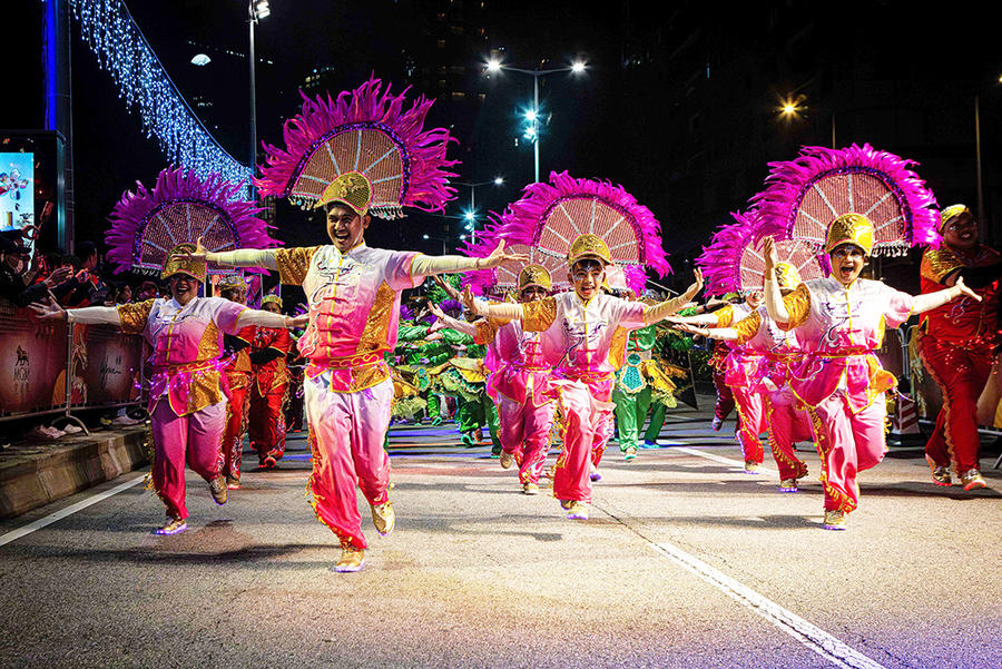 2月12日,舞蹈演员在“庆祝澳门特别行政区成立25周年2024年农历新年花车汇演腾龙运钻欢乐春节”上表演。