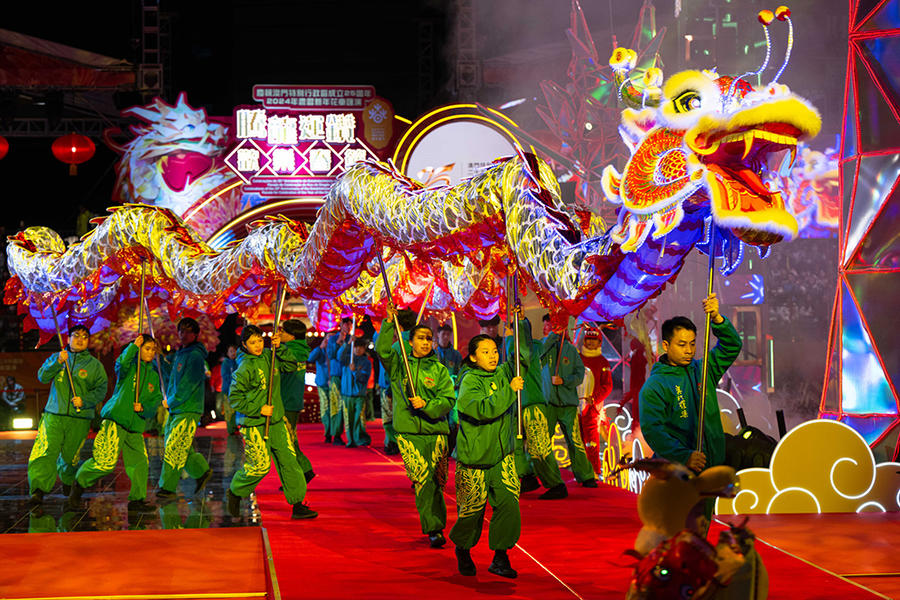 2月12日,演员在“庆祝澳门特别行政区成立25周年2024年农历新年花车汇演腾龙运钻欢乐春节”上表演。