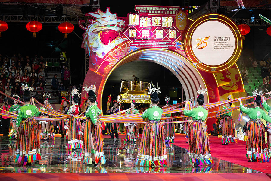 2月12日,少数民族演员在“庆祝澳门特别行政区成立25周年2024年农历新年花车汇演腾龙运钻欢乐春节”上表演。