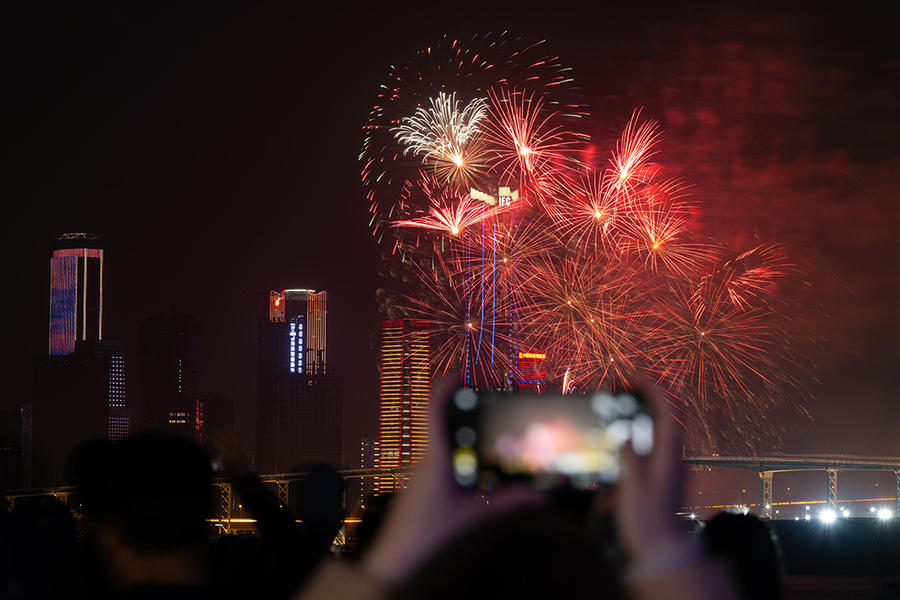 21时45分,以“龙”为主题的首场“欢乐春节─龙马精神烟花汇演”在澳门旅游塔附近海域率先上演。持续15分钟的绚丽烟花在夜空朵朵绽放,将欢乐春节喜庆气氛推向了高潮。