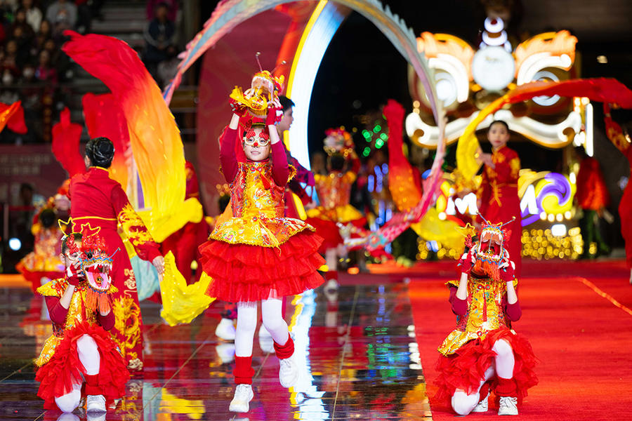 2月12日,小演员们在“庆祝澳门特别行政区成立25周年2024年农历新年花车汇演腾龙运钻欢乐春节”上表演。