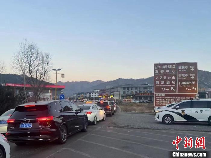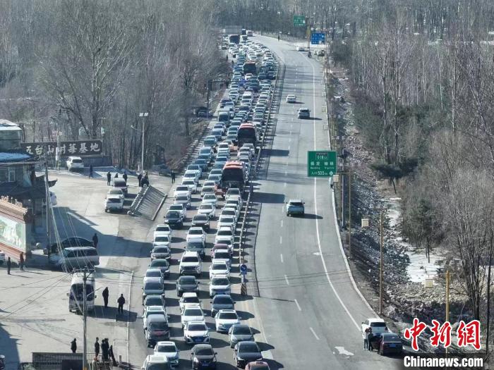2月12日,五台山景区内道路上,车辆排队等候通行。山西交警供图