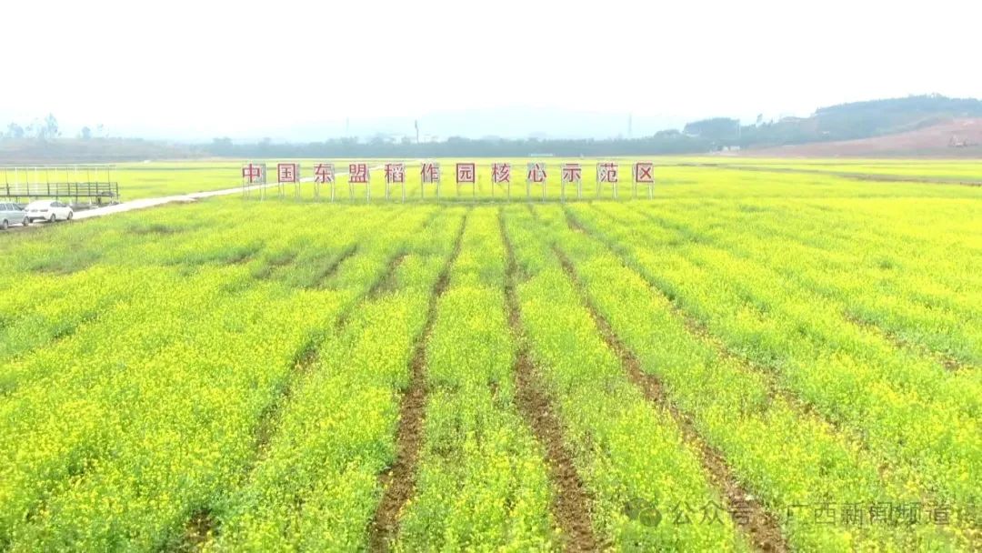 从南宁市区自驾40分钟左右,就能到达青秀区长塘镇天堂村的中国—东盟稻作园核心示范区,800多亩油菜花迎风怒放,春风拂过,花海间蜂飞蝶舞,远山近水皆被金黄色的油菜花掩映其中,交织成一幅生机勃勃的春日美景。