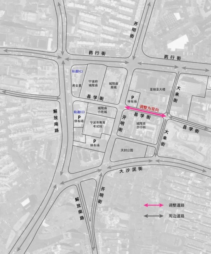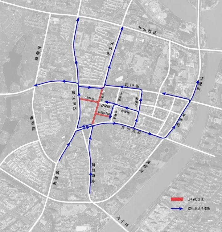 原来往城隍庙片区的车辆,可由大来街、县学街、碶闸街等道路通行。