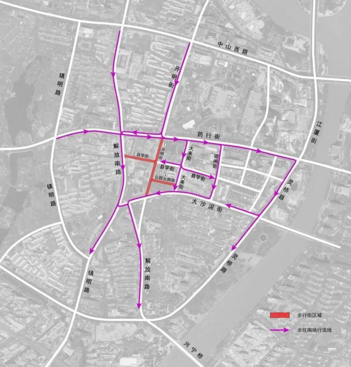 原由开明街北往南过路的车辆,可由药行街-解放南路、碶闸街或灵桥路通行;